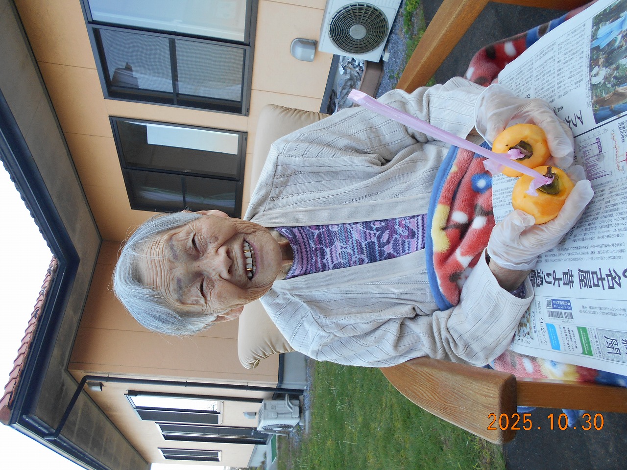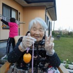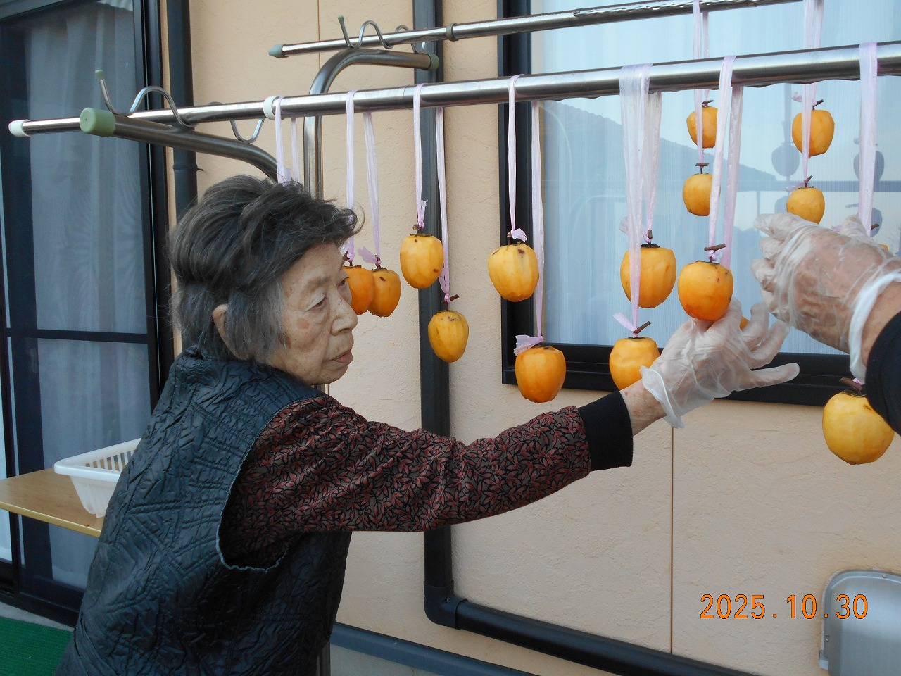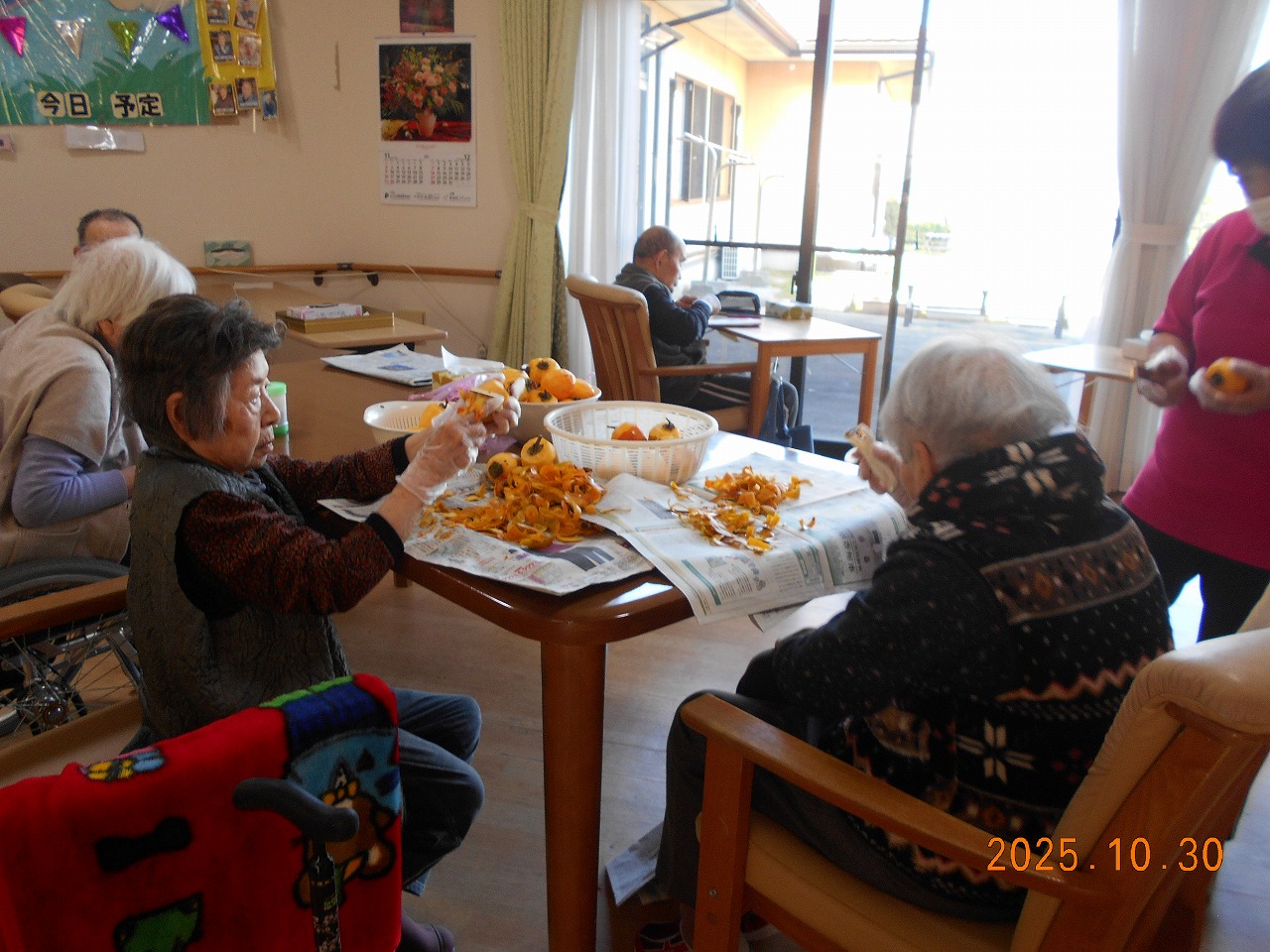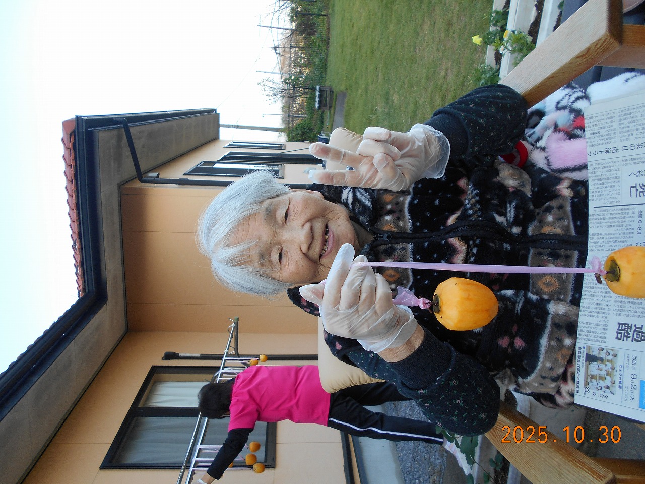いただいた渋柿の皮を剥き、紐を絡げるお手伝いをしていただきました!美味しい干し柿にな~れ\(^o^)/